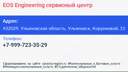 EOS Engineering, сервисный центр по адресу 432029, Ульяновская область, Ульяновск, Корунковой, 15 в дальнейшем Организация, размещена в следующих категориях: