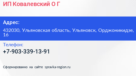 ИП Ковалевский О.Г. по адресу 432030, Ульяновская область, Ульяновск, Орджоникидзе, 16 в дальнейшем Организация, размещена в следующих категориях: