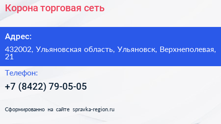 Корона, торговая сеть по адресу 432002, Ульяновская область, Ульяновск, Верхнеполевая, 21 в дальнейшем Организация, размещена в следующих категориях:
