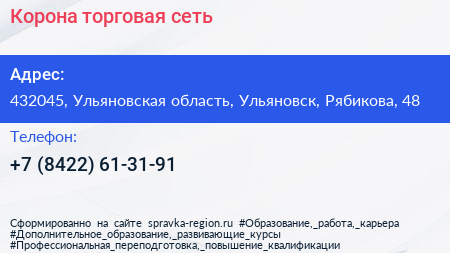 Корона, торговая сеть по адресу 432045, Ульяновская область, Ульяновск, Рябикова, 48 в дальнейшем Организация, размещена в следующих категориях:
