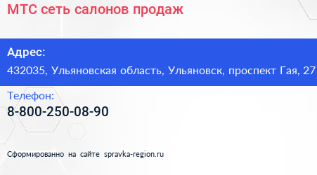 МТС, сеть салонов продаж по адресу 432035, Ульяновская область, Ульяновск, проспект Гая, 27 в дальнейшем Организация, размещена в следующих категориях: