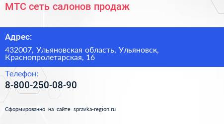 МТС, сеть салонов продаж по адресу 432007, Ульяновская область, Ульяновск, Краснопролетарская, 16 в дальнейшем Организация, размещена в следующих категориях: