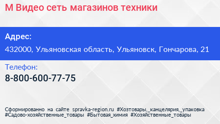 М.Видео, сеть магазинов техники по адресу 432000, Ульяновская область, Ульяновск, Гончарова, 21 в дальнейшем Организация, размещена в следующих категориях: