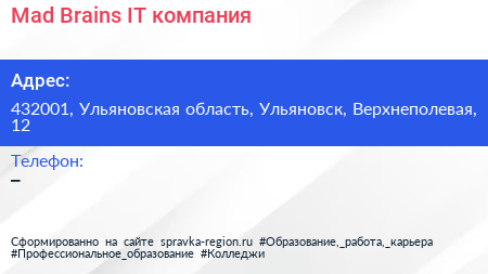 Mad Brains, IT-компания по адресу 432001, Ульяновская область, Ульяновск, Верхнеполевая, 12 в дальнейшем Организация, размещена в следующих категориях: