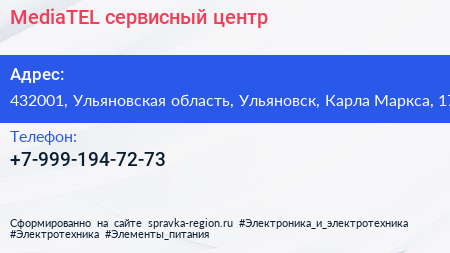 MediaTEL, сервисный центр по адресу 432001, Ульяновская область, Ульяновск, Карла Маркса, 17 в дальнейшем Организация, размещена в следующих категориях: