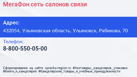 МегаФон, сеть салонов связи по адресу 432054, Ульяновская область, Ульяновск, Рябикова, 70 в дальнейшем Организация, размещена в следующих категориях: