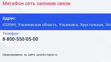 МегаФон, сеть салонов связи по адресу 432044, Ульяновская область, Ульяновск, Хрустальная, 34а в дальнейшем Организация, размещена в следующих категориях: