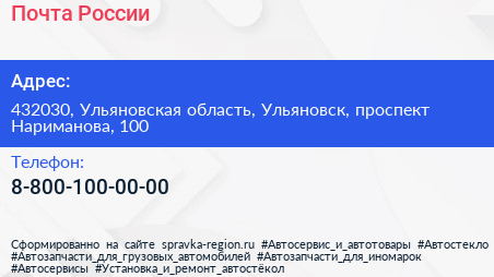 Почта России по адресу 432030, Ульяновская область, Ульяновск, проспект Нариманова, 100 в дальнейшем Организация, размещена в следующих категориях: