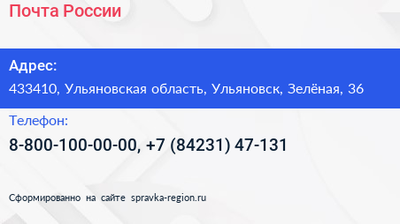 Почта России по адресу 433410, Ульяновская область, Ульяновск, Зелёная, 36 в дальнейшем Организация, размещена в следующих категориях: