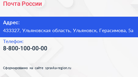 Почта России по адресу 433327, Ульяновская область, Ульяновск, Герасимова, 5а в дальнейшем Организация, размещена в следующих категориях: