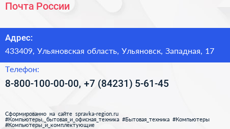 Почта России по адресу 433409, Ульяновская область, Ульяновск, Западная, 17 в дальнейшем Организация, размещена в следующих категориях: