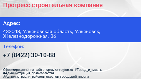 Прогресс, строительная компания по адресу 432048, Ульяновская область, Ульяновск, Железнодорожная, 36 в дальнейшем Организация, размещена в следующих категориях: