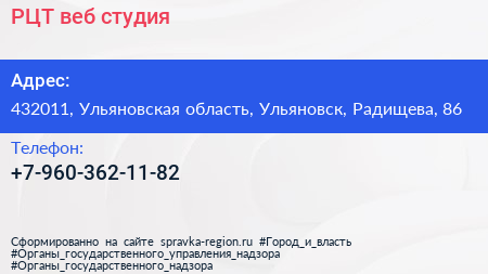 РЦТ, веб-студия по адресу 432011, Ульяновская область, Ульяновск, Радищева, 86 в дальнейшем Организация, размещена в следующих категориях: