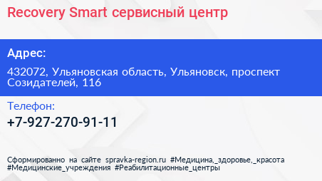 Recovery Smart, сервисный центр по адресу 432072, Ульяновская область, Ульяновск, проспект Созидателей, 116 в дальнейшем Организация, размещена в следующих категориях:
