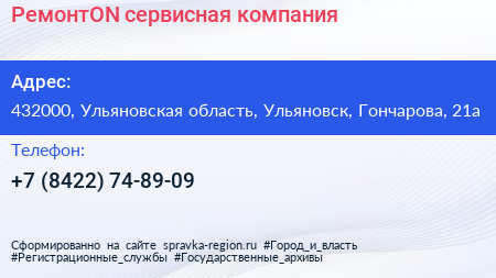 РемонтON, сервисная компания по адресу 432000, Ульяновская область, Ульяновск, Гончарова, 21а в дальнейшем Организация, размещена в следующих категориях: