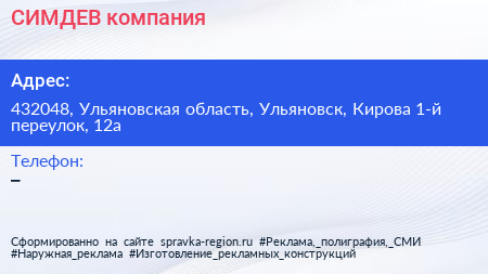 СИМДЕВ, компания по адресу 432048, Ульяновская область, Ульяновск, Кирова 1-й переулок, 12а в дальнейшем Организация, размещена в следующих категориях: