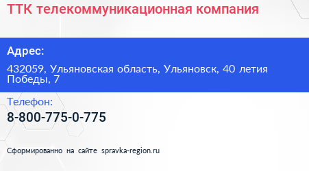 ТТК, телекоммуникационная компания по адресу 432059, Ульяновская область, Ульяновск, 40 летия Победы, 7 в дальнейшем Организация, размещена в следующих категориях: