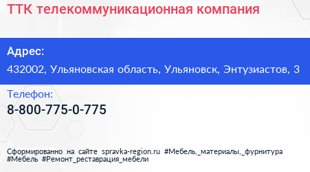 ТТК, телекоммуникационная компания по адресу 432002, Ульяновская область, Ульяновск, Энтузиастов, 3 в дальнейшем Организация, размещена в следующих категориях: