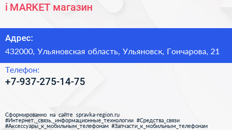 i.MARKET, магазин по адресу 432000, Ульяновская область, Ульяновск, Гончарова, 21 в дальнейшем Организация, размещена в следующих категориях: