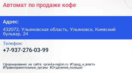 Автомат по продаже кофе по адресу 432072, Ульяновская область, Ульяновск, Киевский бульвар, 24 в дальнейшем Организация, размещена в следующих категориях: