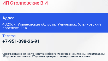 ИП Столповских В.И. по адресу 432067, Ульяновская область, Ульяновск, Ульяновский проспект, 11а в дальнейшем Организация, размещена в следующих категориях: