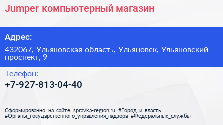 Jumper, компьютерный магазин по адресу 432067, Ульяновская область, Ульяновск, Ульяновский проспект, 9 в дальнейшем Организация, размещена в следующих категориях: