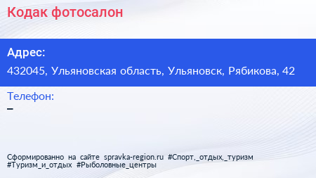 Кодак, фотосалон по адресу 432045, Ульяновская область, Ульяновск, Рябикова, 42 в дальнейшем Организация, размещена в следующих категориях: