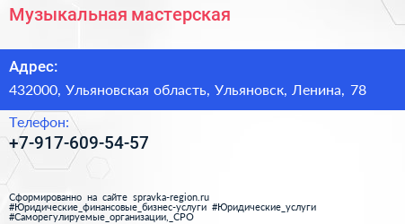 Музыкальная мастерская по адресу 432000, Ульяновская область, Ульяновск, Ленина, 78 в дальнейшем Организация, размещена в следующих категориях: