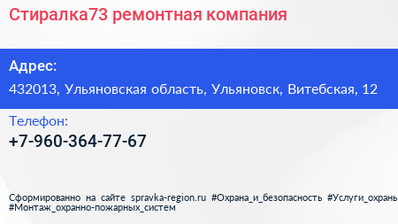 Стиралка73, ремонтная компания по адресу 432013, Ульяновская область, Ульяновск, Витебская, 12 в дальнейшем Организация, размещена в следующих категориях: