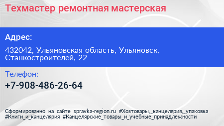 Техмастер, ремонтная мастерская по адресу 432042, Ульяновская область, Ульяновск, Станкостроителей, 22 в дальнейшем Организация, размещена в следующих категориях:
