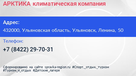АРКТИКА, климатическая компания по адресу 432000, Ульяновская область, Ульяновск, Ленина, 50 в дальнейшем Организация, размещена в следующих категориях: