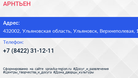 АРНТЬЕН по адресу 432002, Ульяновская область, Ульяновск, Верхнеполевая, 1 в дальнейшем Организация, размещена в следующих категориях: