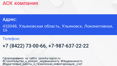 АСК, компания по адресу 432048, Ульяновская область, Ульяновск, Локомотивная, 16 в дальнейшем Организация, размещена в следующих категориях: