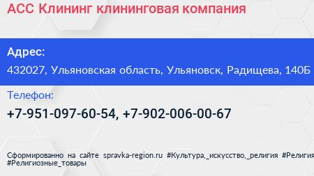 АСС Клининг, клининговая компания по адресу 432027, Ульяновская область, Ульяновск, Радищева, 140Б в дальнейшем Организация, размещена в следующих категориях: