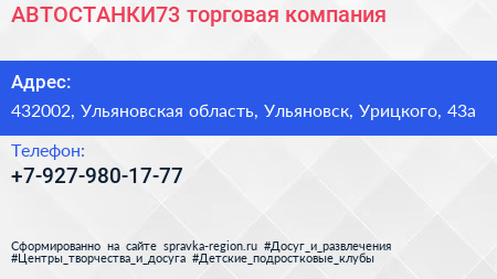 АВТОСТАНКИ73, торговая компания по адресу 432002, Ульяновская область, Ульяновск, Урицкого, 43а в дальнейшем Организация, размещена в следующих категориях: