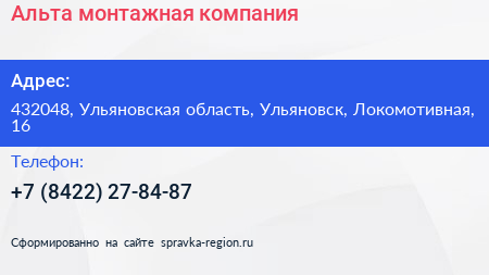 Альта, монтажная компания по адресу 432048, Ульяновская область, Ульяновск, Локомотивная, 16 в дальнейшем Организация, размещена в следующих категориях: