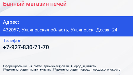Банный, магазин печей по адресу 432057, Ульяновская область, Ульяновск, Деева, 24 в дальнейшем Организация, размещена в следующих категориях:
