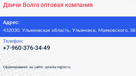 Даичи-Волга, оптовая компания по адресу 432030, Ульяновская область, Ульяновск, Маяковского, 38 в дальнейшем Организация, размещена в следующих категориях: