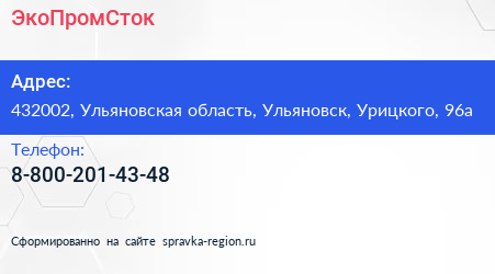 ЭкоПромСток по адресу 432002, Ульяновская область, Ульяновск, Урицкого, 96а в дальнейшем Организация, размещена в следующих категориях: