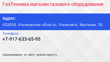 ГазТехника, магазин газового оборудования по адресу 432018, Ульяновская область, Ульяновск, Хваткова, 1Б в дальнейшем Организация, размещена в следующих категориях: