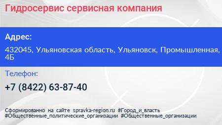 Гидросервис, сервисная компания по адресу 432045, Ульяновская область, Ульяновск, Промышленная, 4Б в дальнейшем Организация, размещена в следующих категориях: