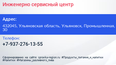 Инженерно-сервисный центр по адресу 432045, Ульяновская область, Ульяновск, Промышленная, 30 в дальнейшем Организация, размещена в следующих категориях: