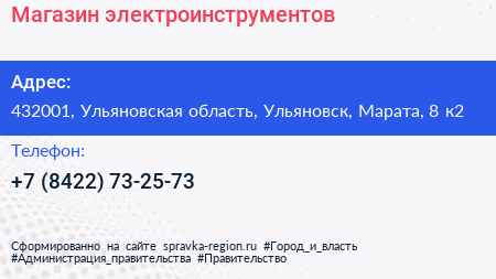 Магазин электроинструментов по адресу 432001, Ульяновская область, Ульяновск, Марата, 8 к2 в дальнейшем Организация, размещена в следующих категориях: