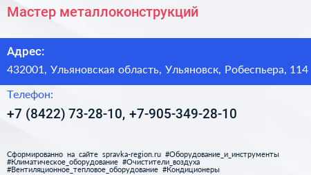 Мастер металлоконструкций по адресу 432001, Ульяновская область, Ульяновск, Робеспьера, 114 в дальнейшем Организация, размещена в следующих категориях: