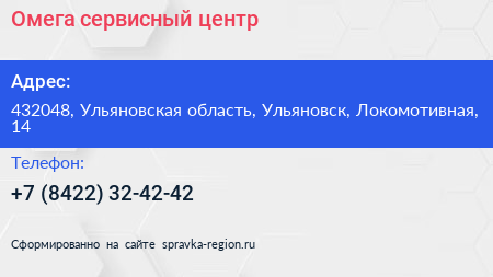 Омега, сервисный центр по адресу 432048, Ульяновская область, Ульяновск, Локомотивная, 14 в дальнейшем Организация, размещена в следующих категориях: