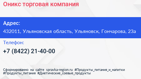 Оникс, торговая компания по адресу 432011, Ульяновская область, Ульяновск, Гончарова, 23а в дальнейшем Организация, размещена в следующих категориях: