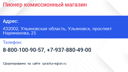 Пионер, комиссионный магазин по адресу 432002, Ульяновская область, Ульяновск, проспект Нариманова, 21 в дальнейшем Организация, размещена в следующих категориях: