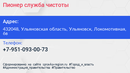 Пионер, служба чистоты по адресу 432048, Ульяновская область, Ульяновск, Локомотивная, 6в в дальнейшем Организация, размещена в следующих категориях:
