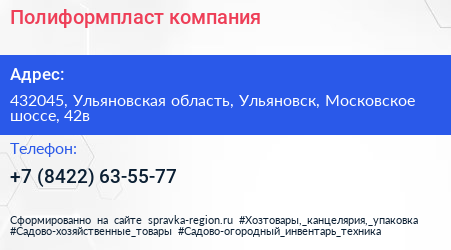 Полиформпласт, компания по адресу 432045, Ульяновская область, Ульяновск, Московское шоссе, 42в в дальнейшем Организация, размещена в следующих категориях: