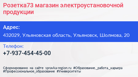 Розетка73, магазин электроустановочной продукции по адресу 432029, Ульяновская область, Ульяновск, Шолмова, 20 в дальнейшем Организация, размещена в следующих категориях: